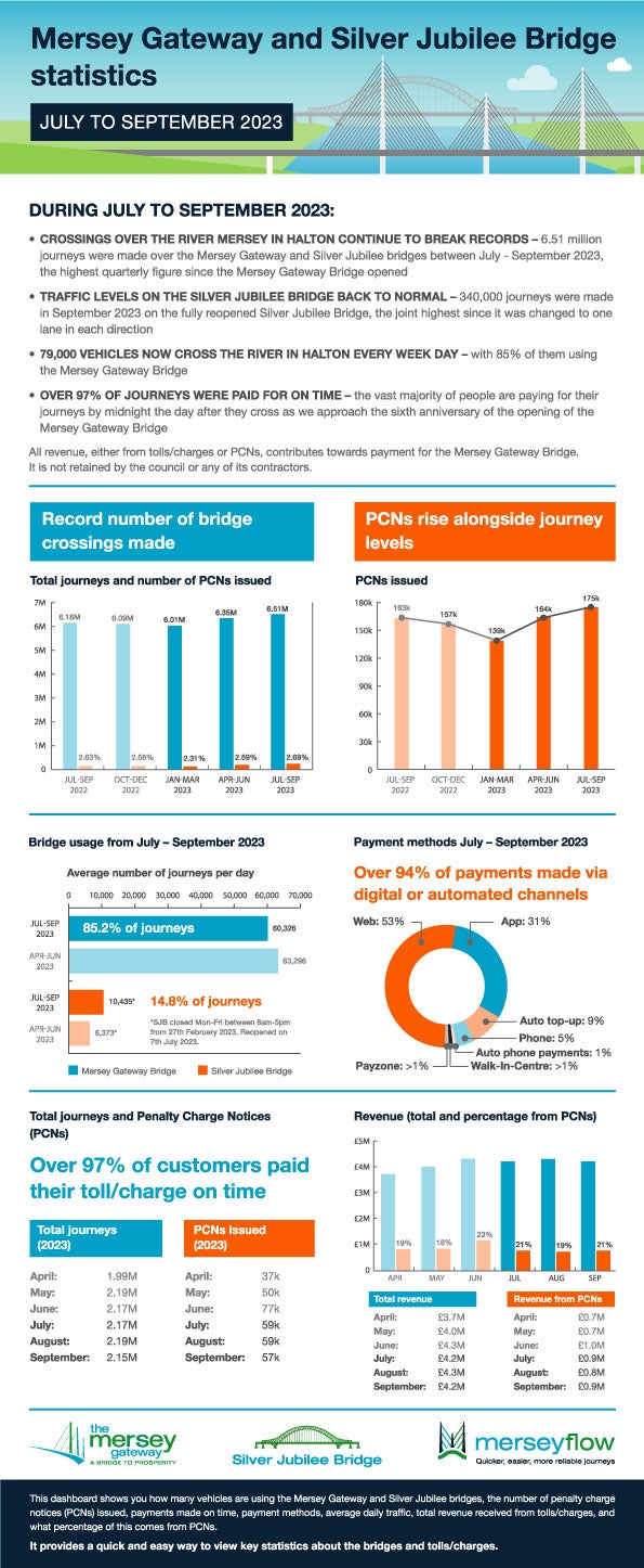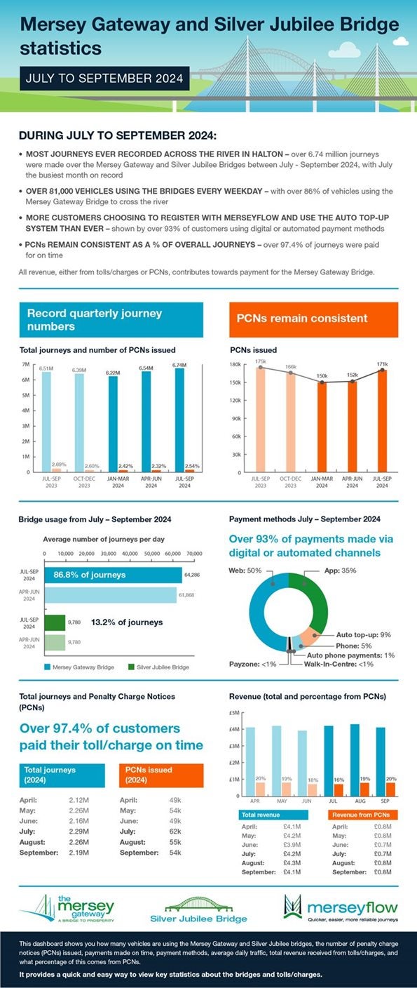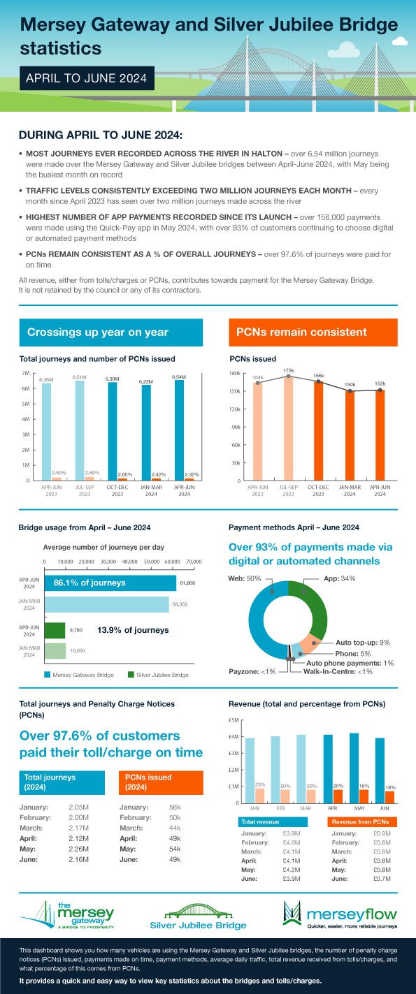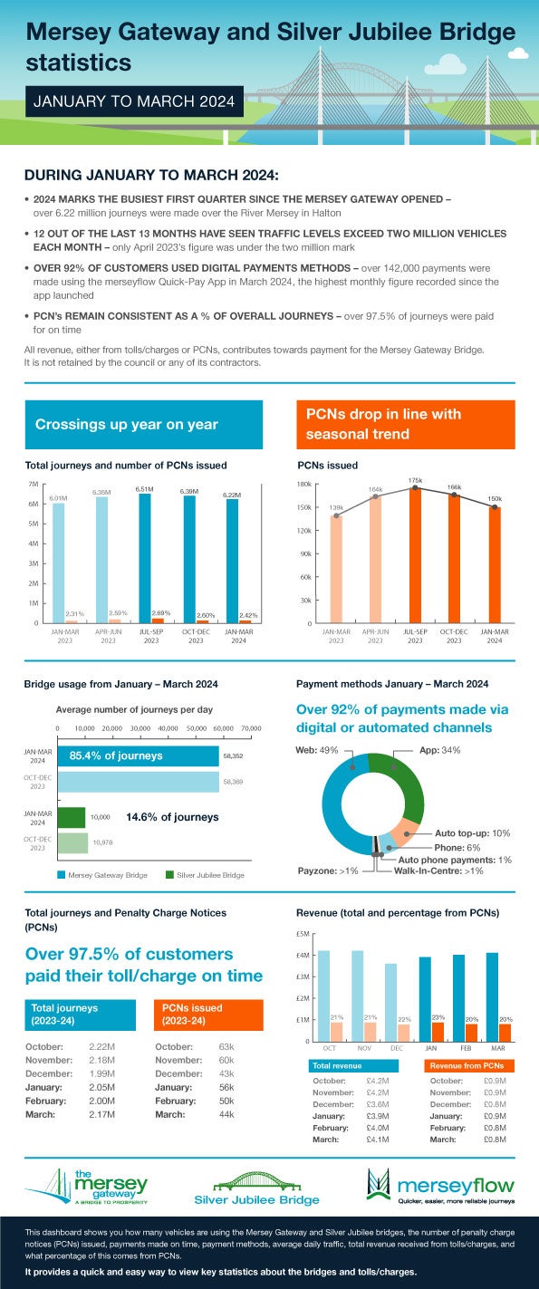 Merseyflow on behalf of the Mersey Gateway Crossings Board, have put together the below infographics containing quarterly statistics for the Mersey Gateway Bridge and Silver Jubilee Bridge.