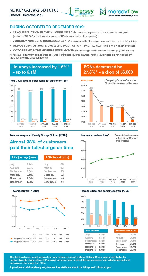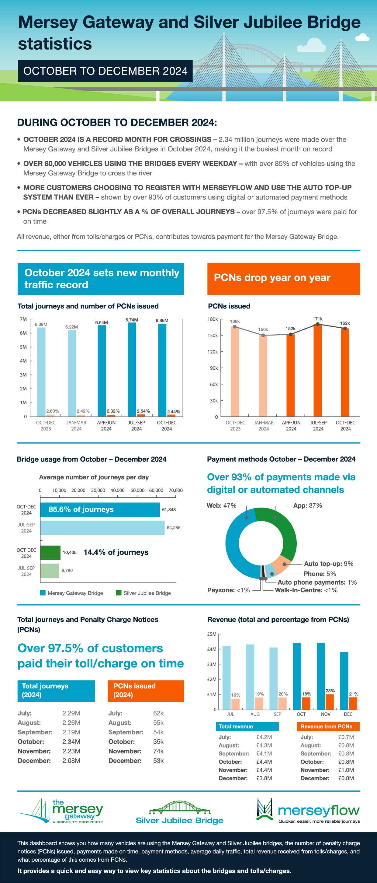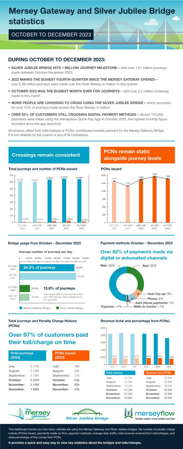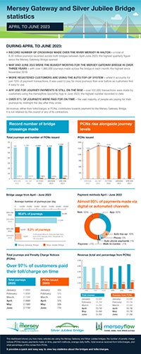 Merseyflow on behalf of the Mersey Gateway Crossings Board, have put together the below infographics containing quarterly statistics for the Mersey Gateway Bridge and Silver Jubilee Bridge.